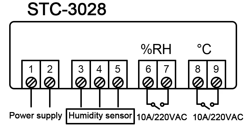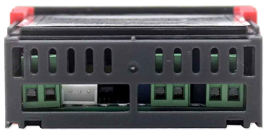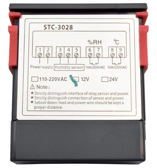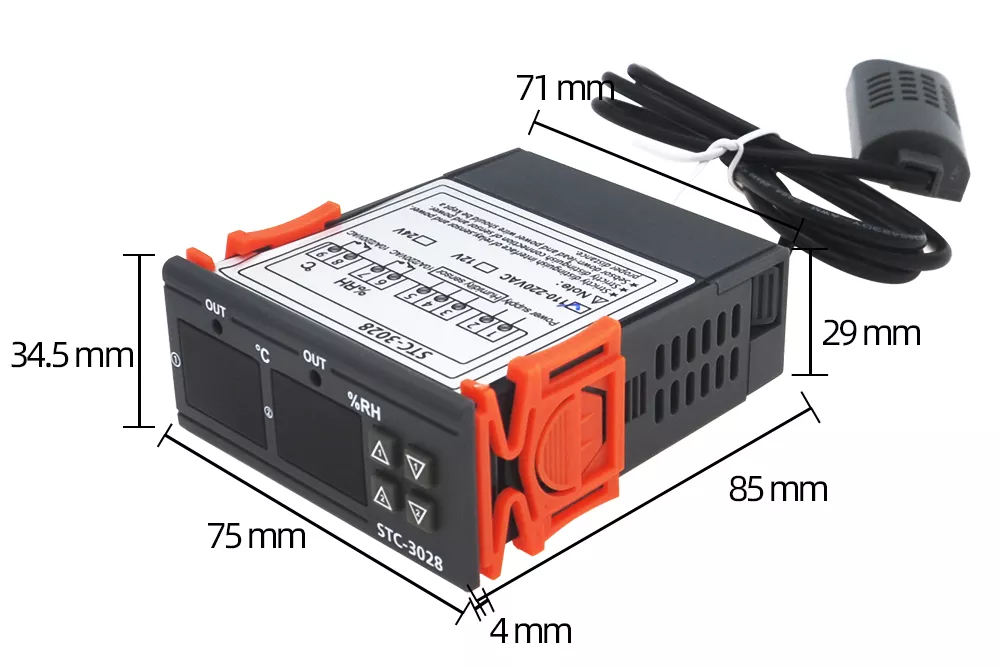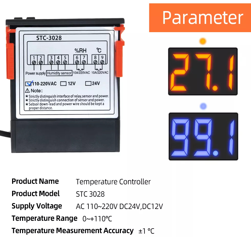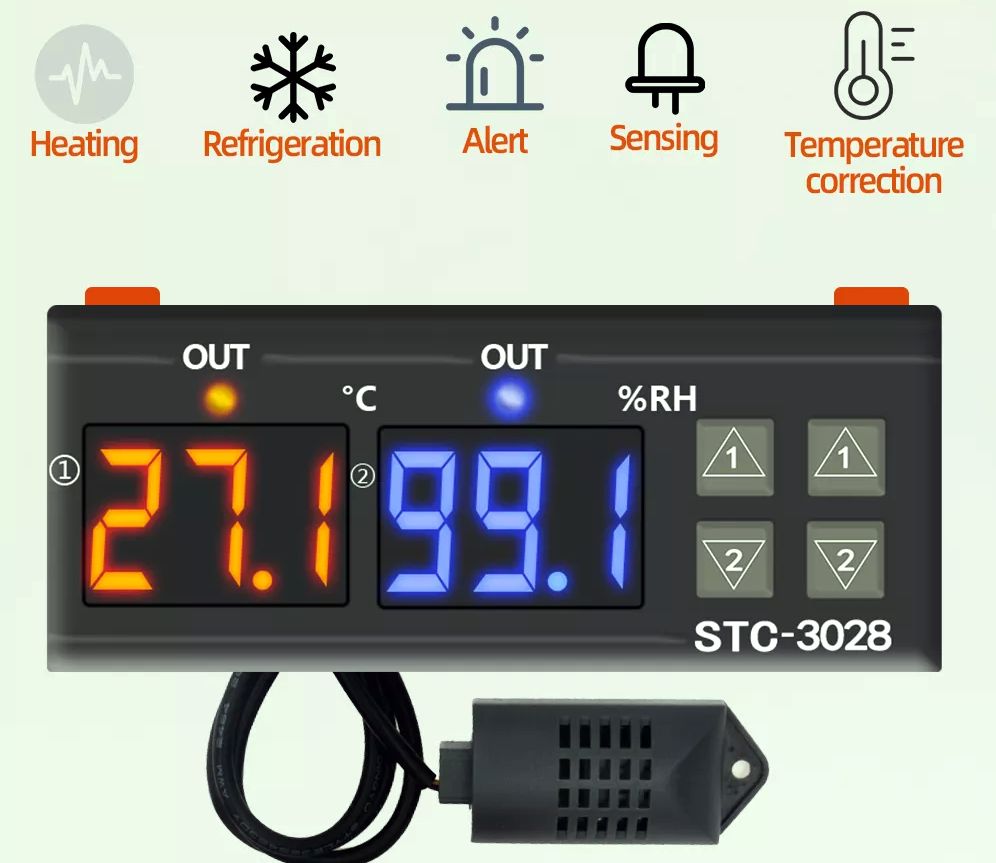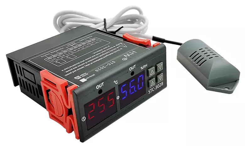 Regulator temperatury i wilgotności w zestawie z czujnikiem zasilany napięcie 230V. Posiada 2 czytelne wyświetlacze: czerwony odpowiedzialny za wskazania temperatury i niebieski pokazujący wilgotność oraz gumowe przyciski do zmiany konfiguracji. Nad każdym z wyświetlaczy znajduje się dioda, która świeci się w momencie uruchomienia urządzenia regulującego temperaturę/wilgotność. W zależności od wprowadzonych ustawień regulator może działać jednocześnie w trybie: grzania/chłodzenia i nawilżania/osuszania. Urządzenie jest bardzo łatwe w konfiguracji, może obsłużyć podpięte urządzenia (np.wiatraki, grzejniki, nawilżacze, zraszacze, bojlery) o mocy nie przekraczającej 2500W i maksymalnym poborze prądu 10A dla każdego kanału. Moduł posiada pamięć ustawień, zanik zasilania nie resetuje wprowadzonych wartości. W zestawie zintegrowany czujnik temperatury i wilgotności na przewodzie o długości 1m.