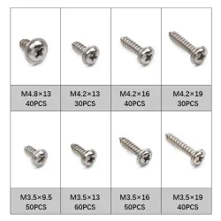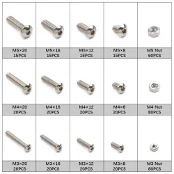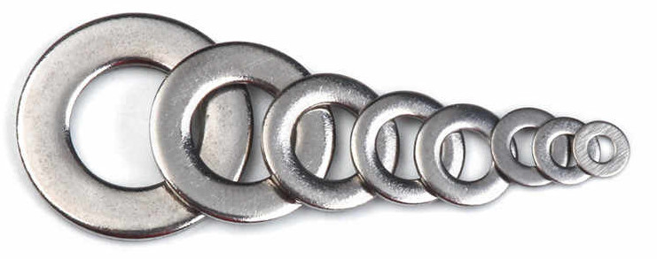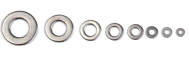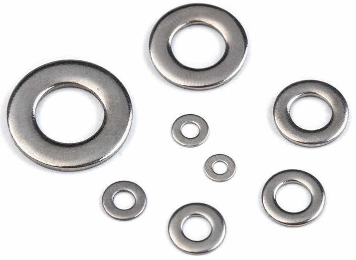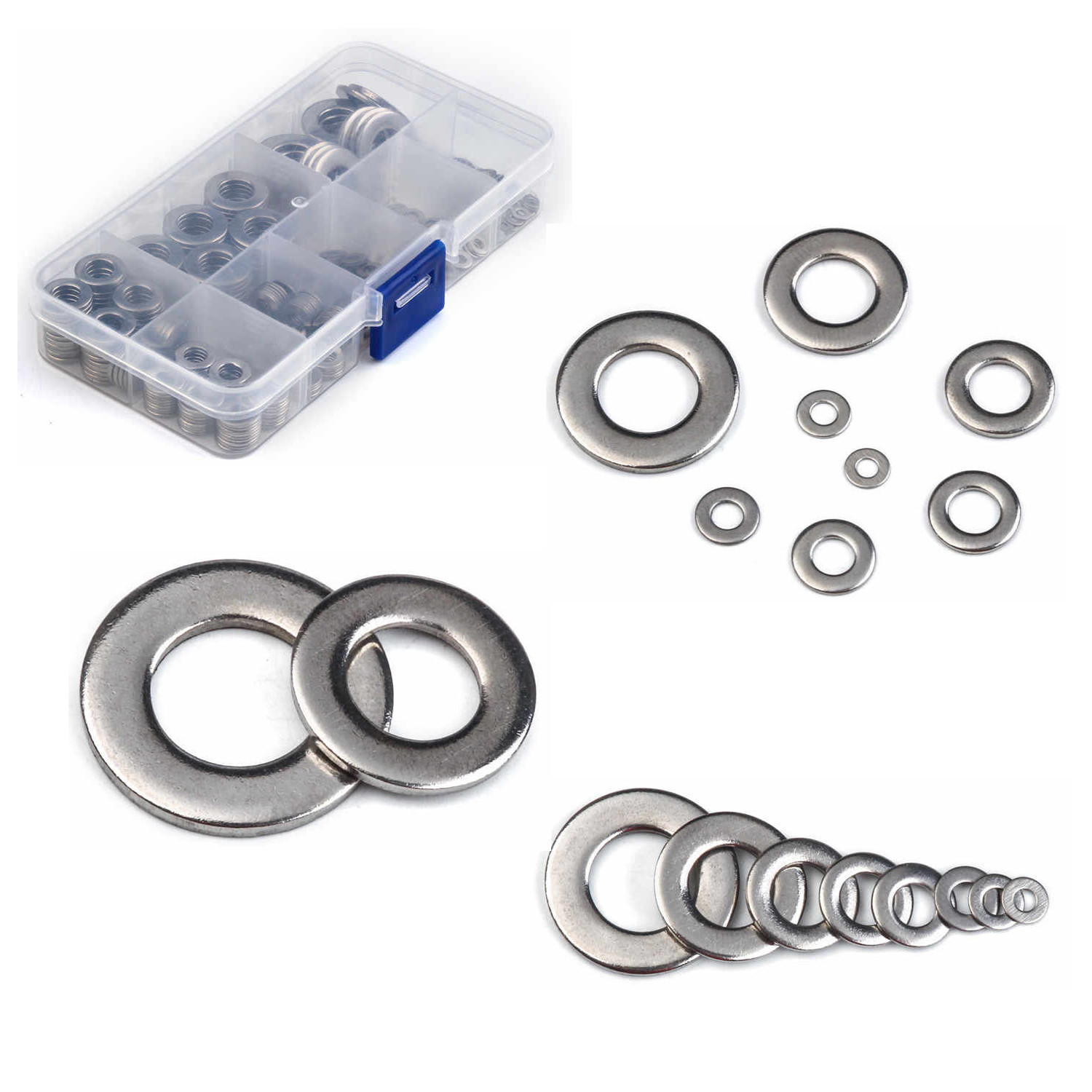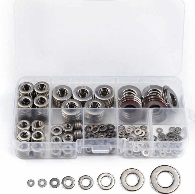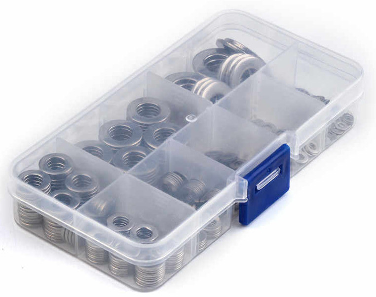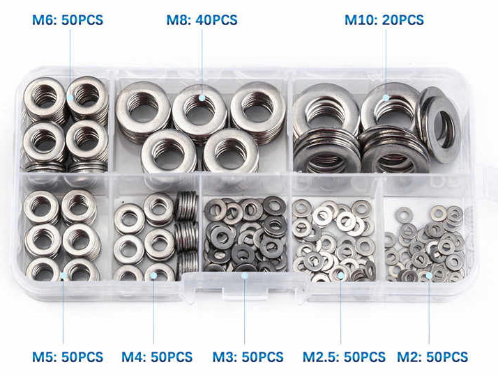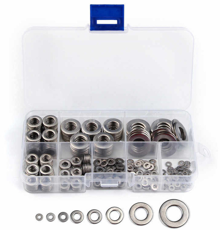 Zestaw 360 sztuk podkładek ze stali nierdzewnej.